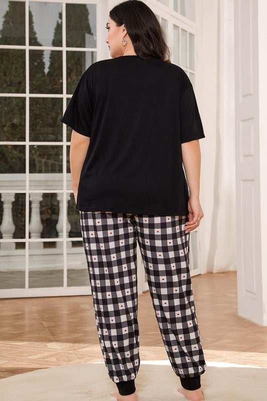 Plus Size Heart Graphic Top and Plaid Joggers Lounge Set