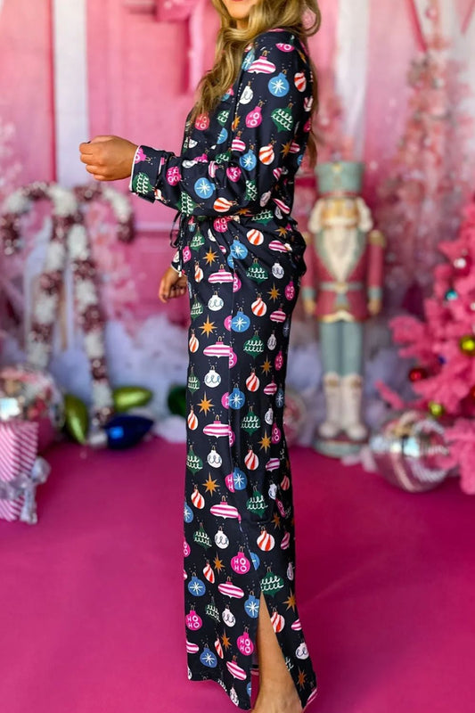 Christmas Printed Collared Neck Top and Pants Lounge Set