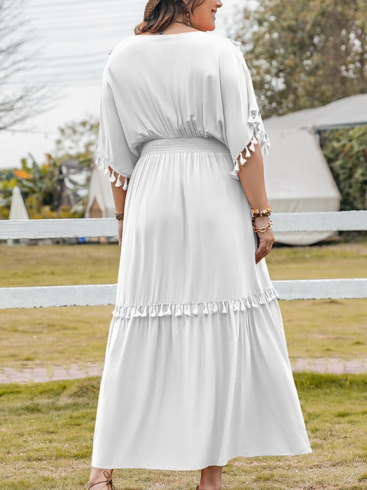 Plus Size Tassel Smocked V-Neck Half Sleeve Dress