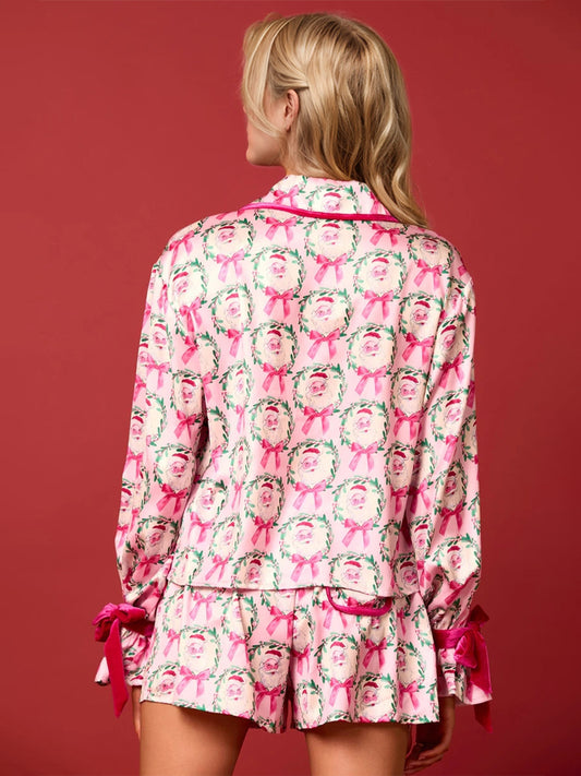 Tied Printed Collared Neck Long Sleeve Top and Shorts Set