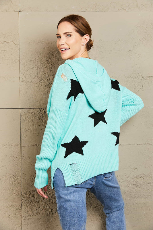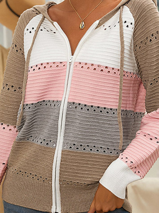 Zip-Up Raglan Sleeve Openwork Hooded Cardigan
