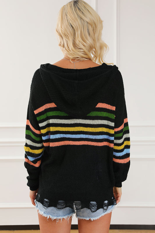 Woven Right Horizontal Ribbing Fringe Trim Hooded Sweater