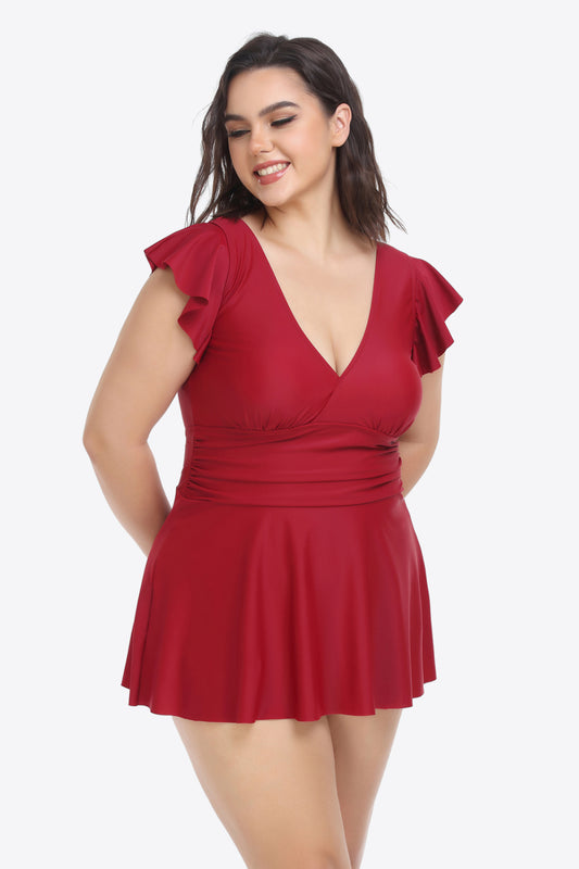 Plus Size Ruffled Plunge Swim Dress and Bottoms Set