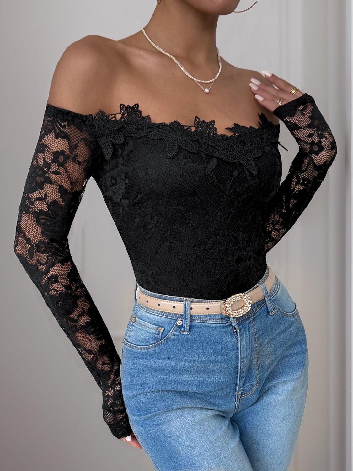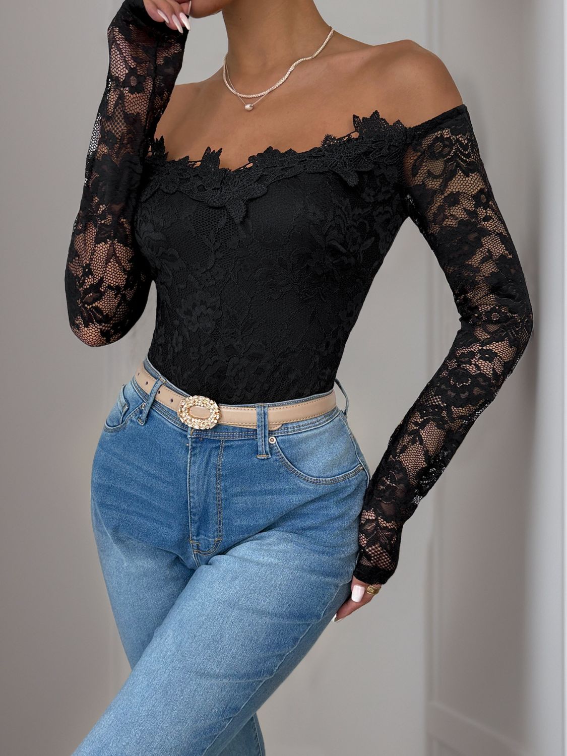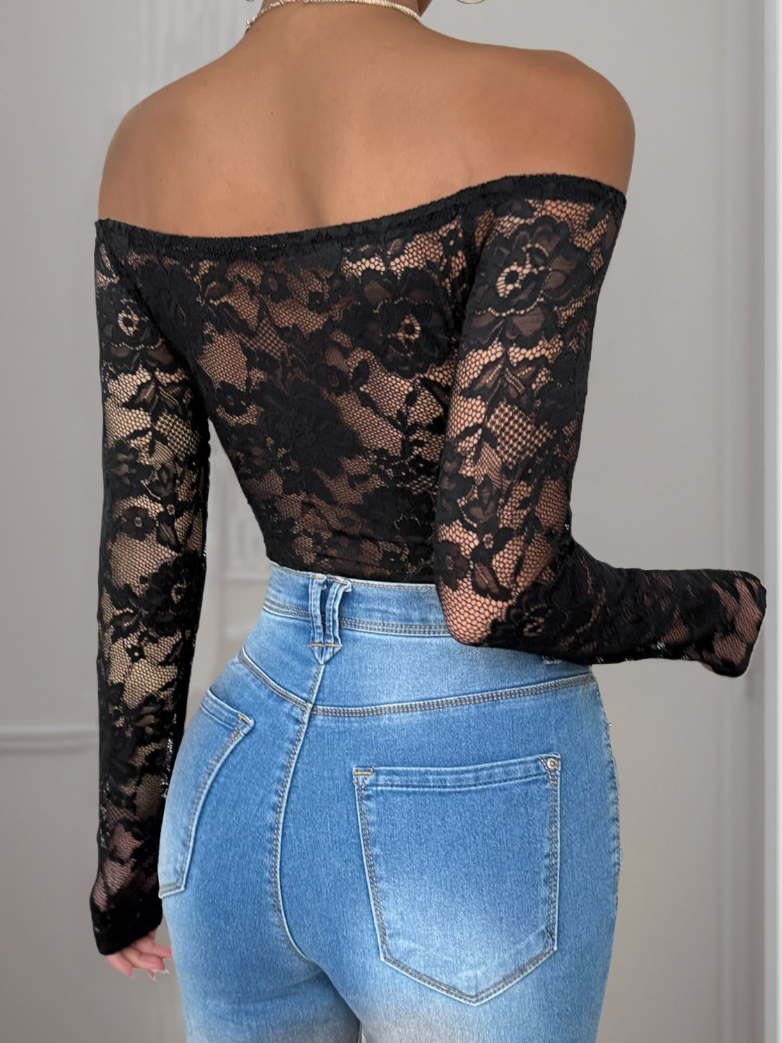 Perfee Lace Off-Shoulder Long Sleeve Bodysuit