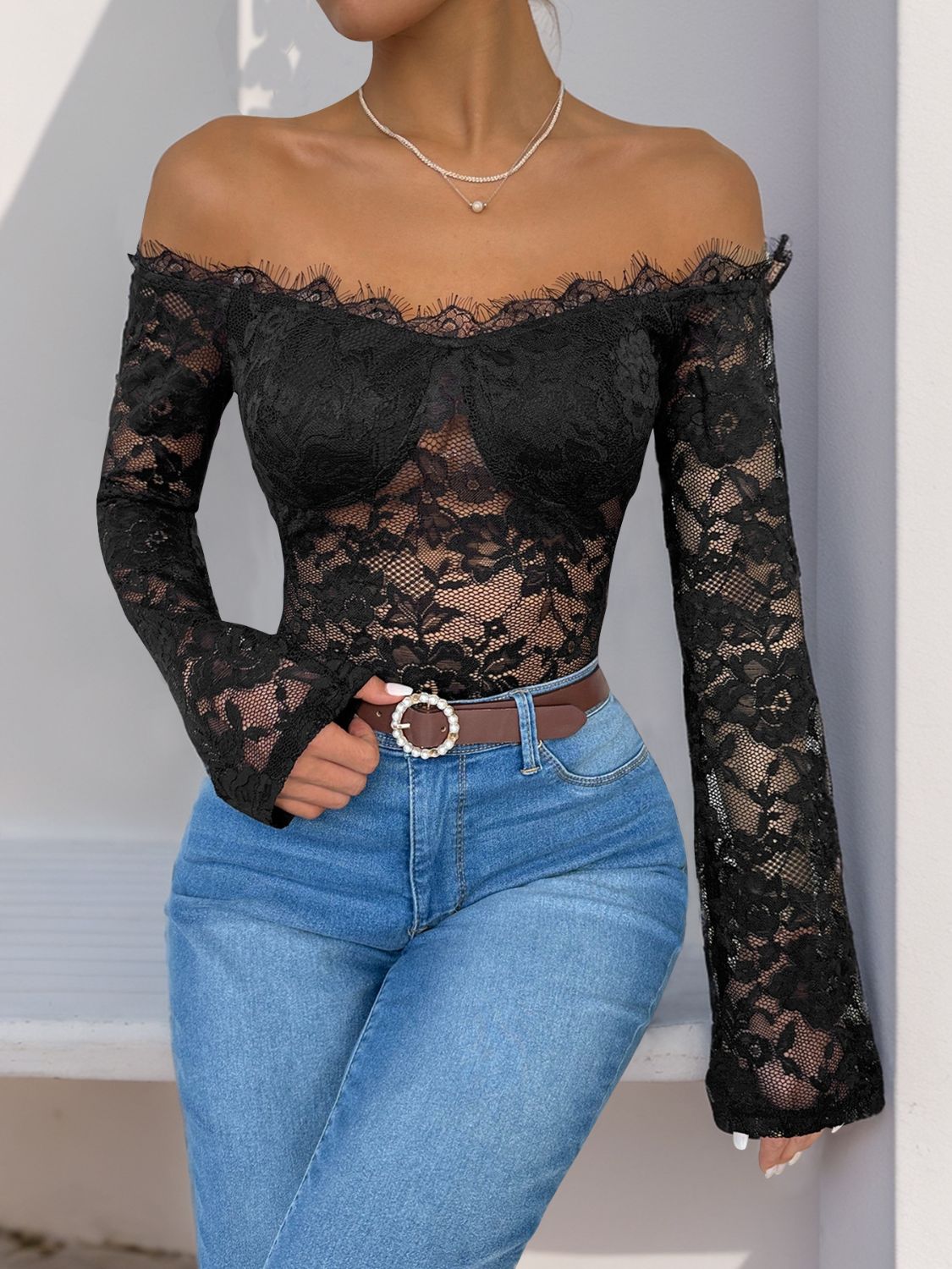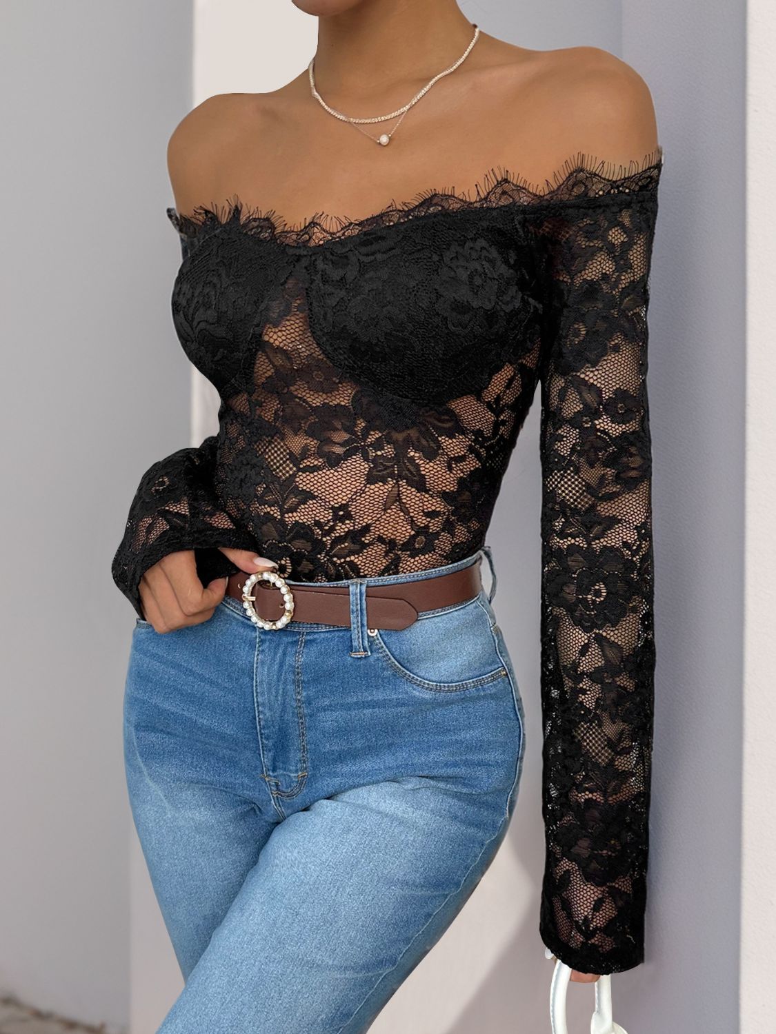Perfee Lace Off-Shoulder Long Sleeve Bodysuit
