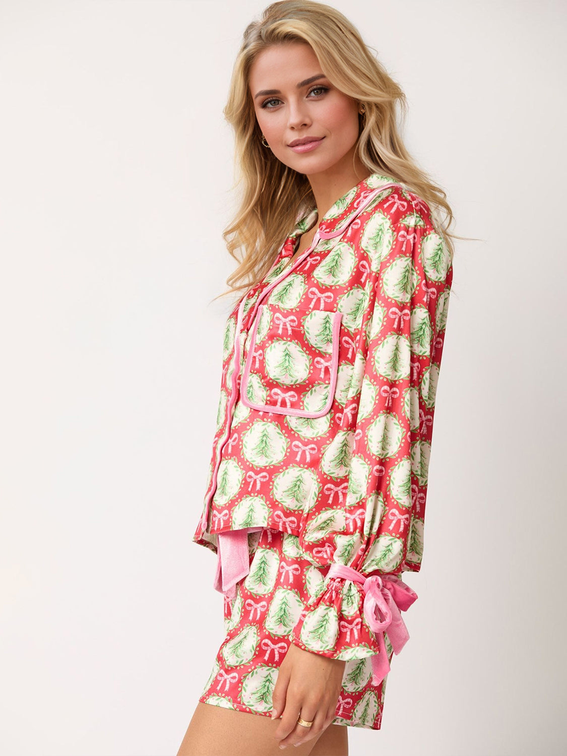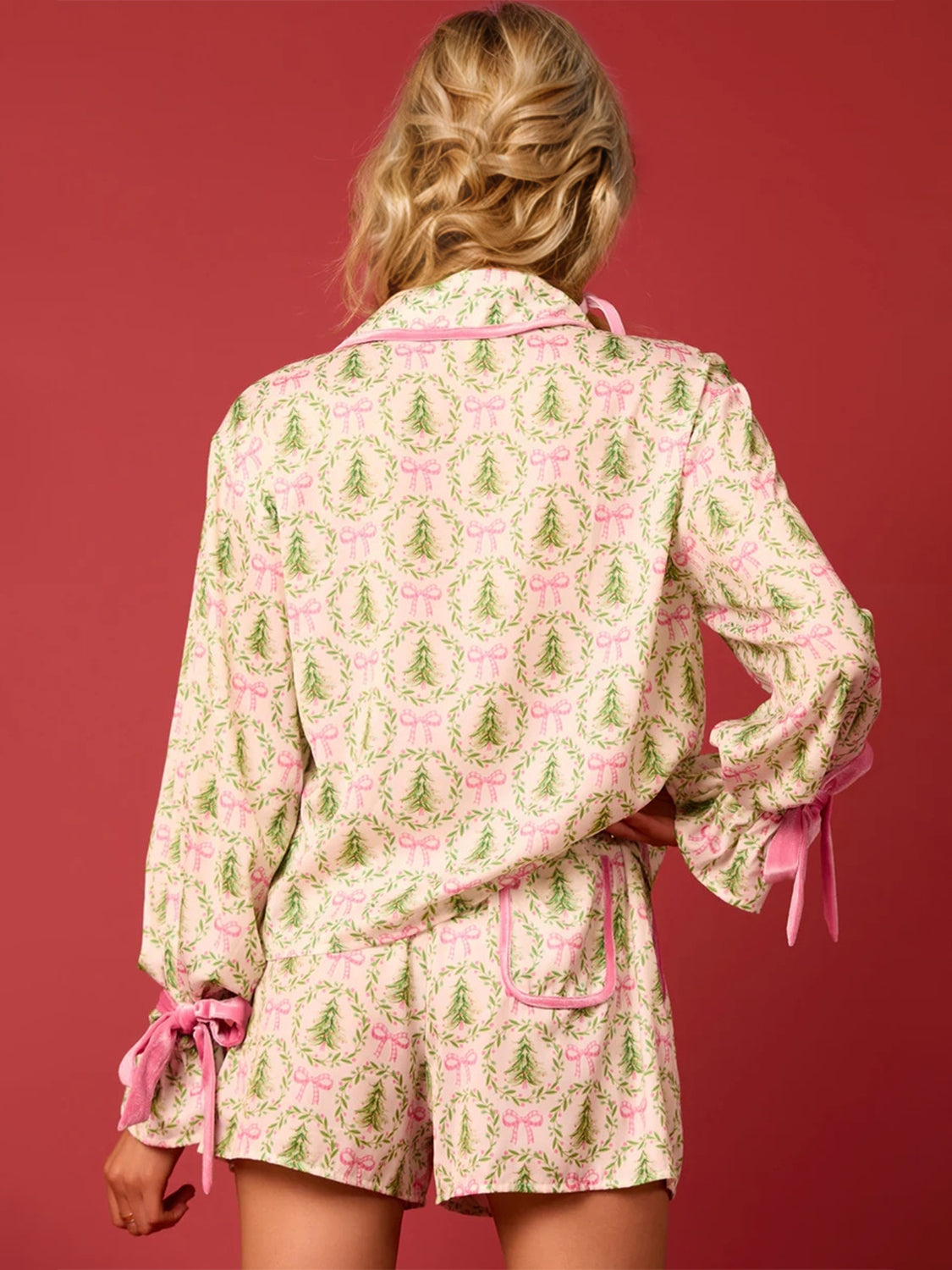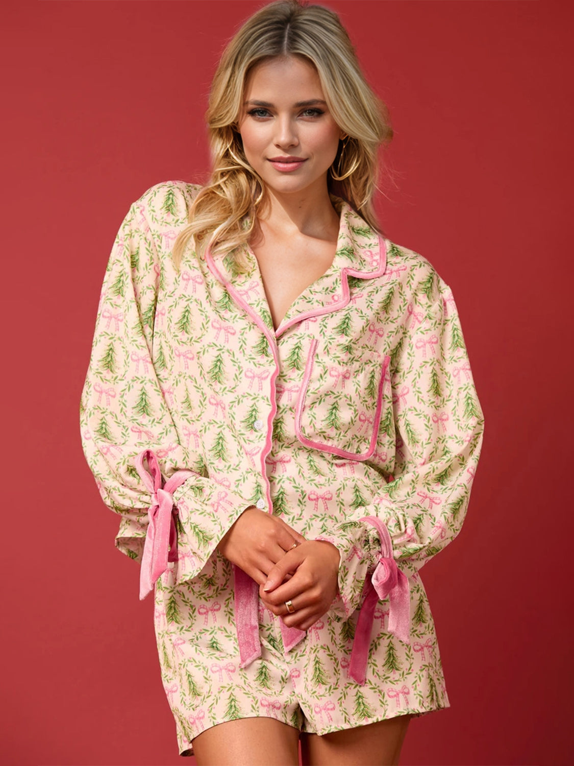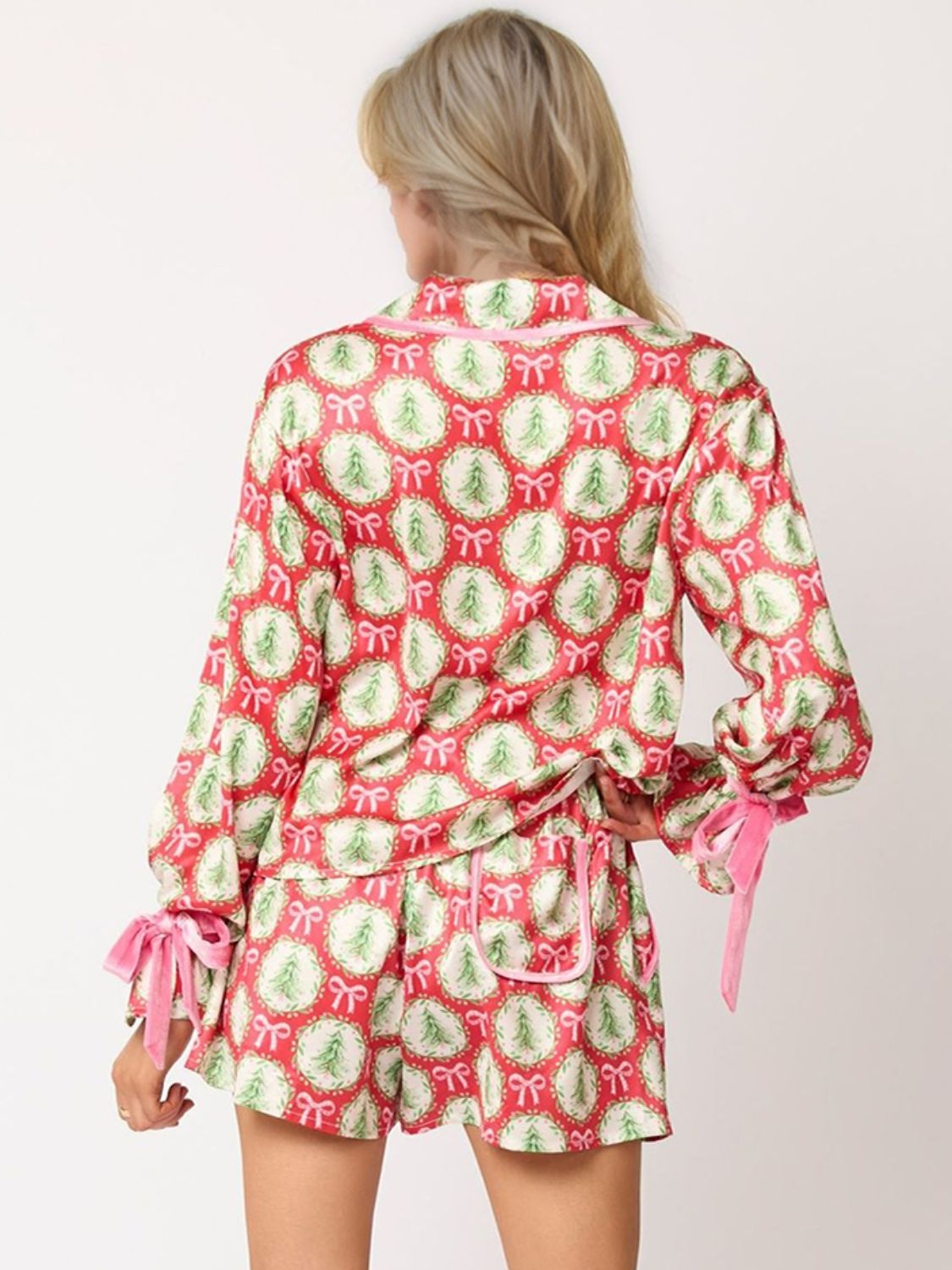 Tied Printed Collared Neck Long Sleeve Top and Shorts Set
