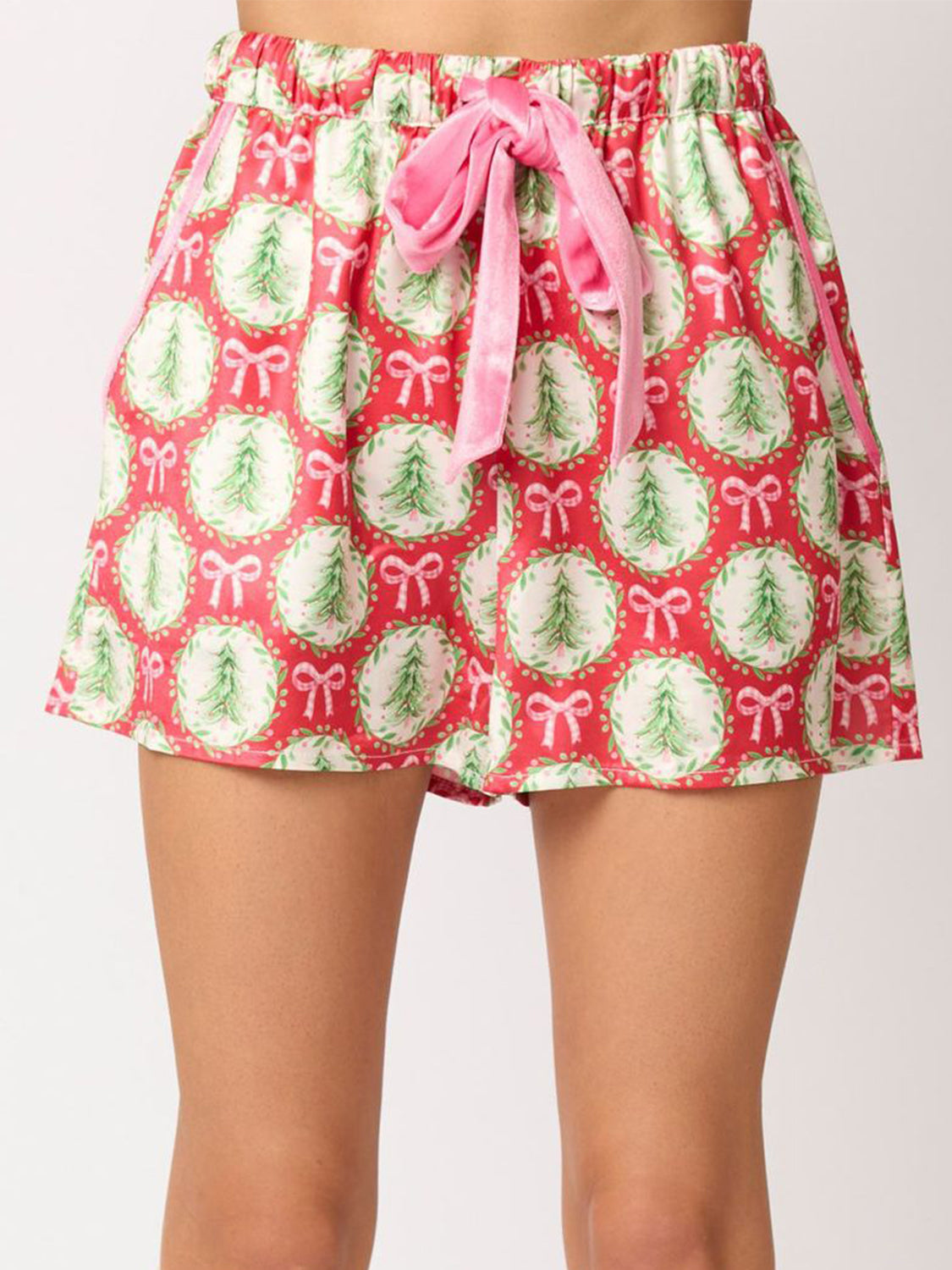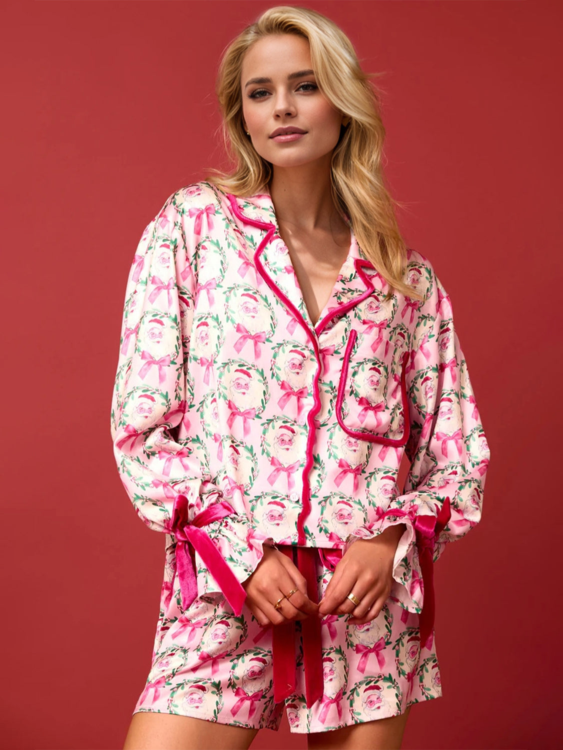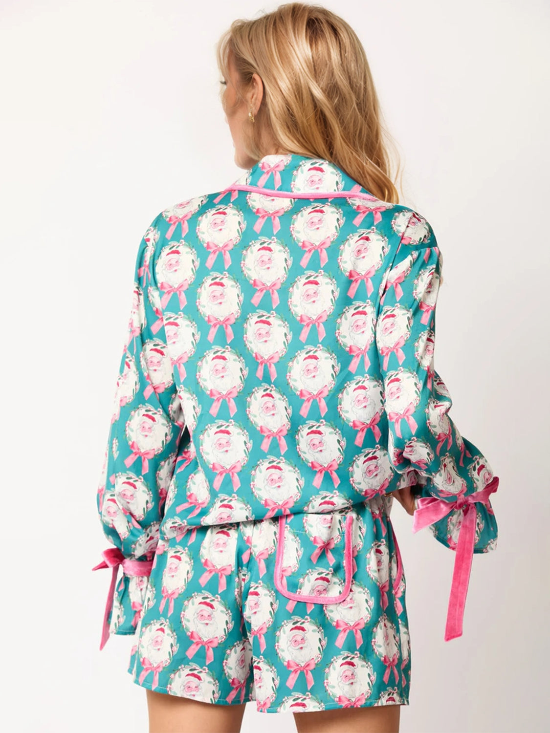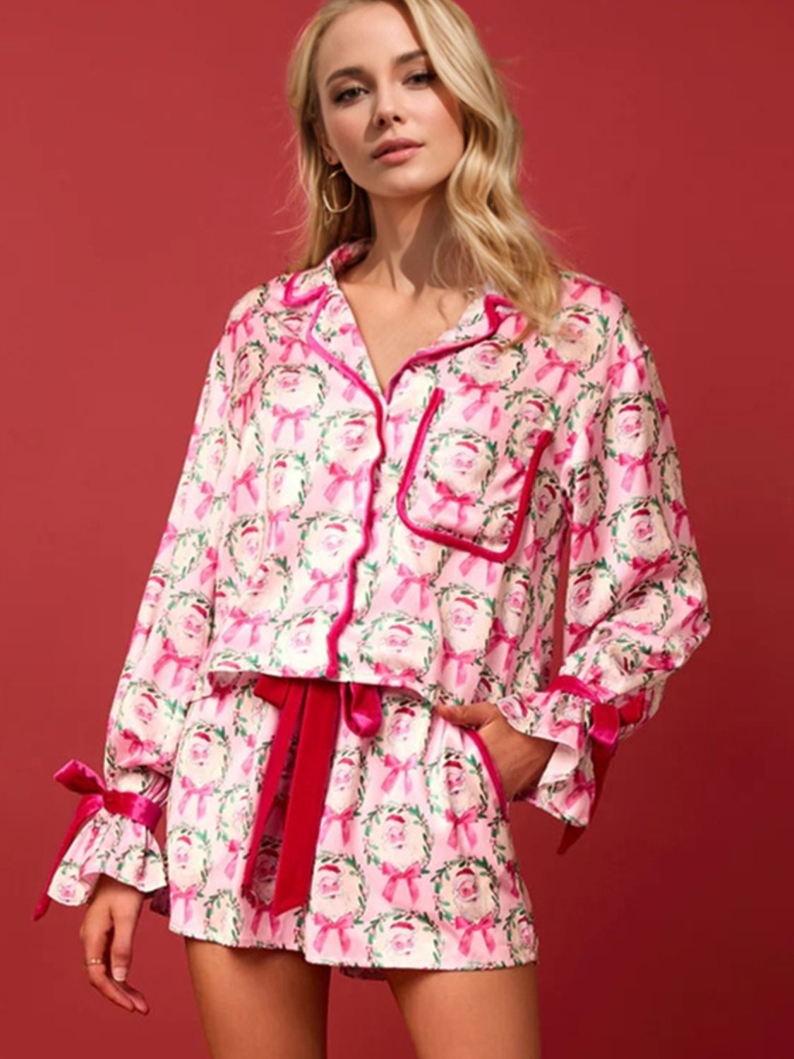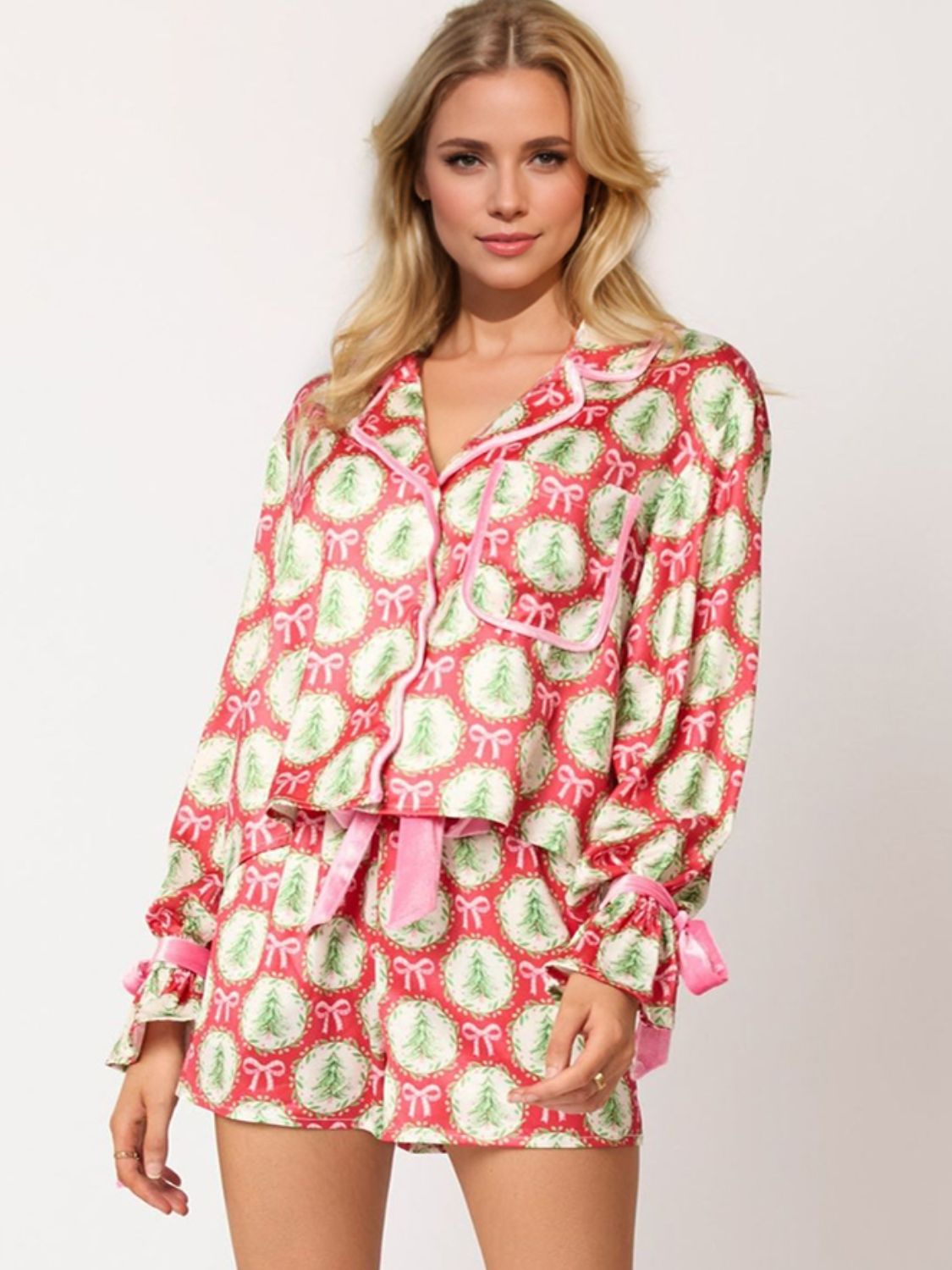 Tied Printed Collared Neck Long Sleeve Top and Shorts Set